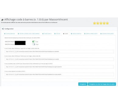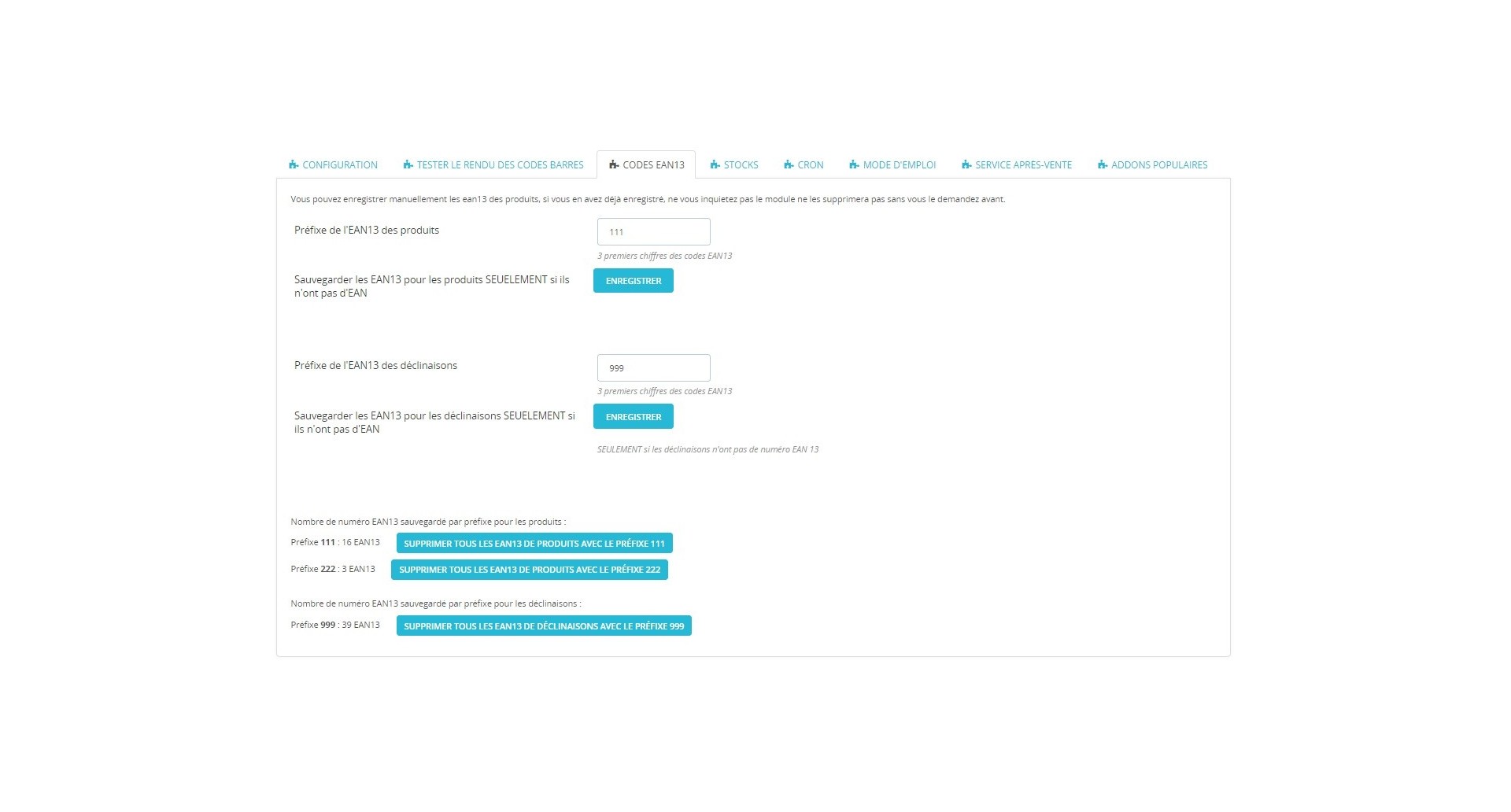 Mit diesem Modul können Sie EAN 13 mit einem EAN-Code-Generator registrieren (mit einem spezifischen Präfix für die Produkte und einem für die Kombinationen, um sie besser zu trennen und leichter zu identifizieren).