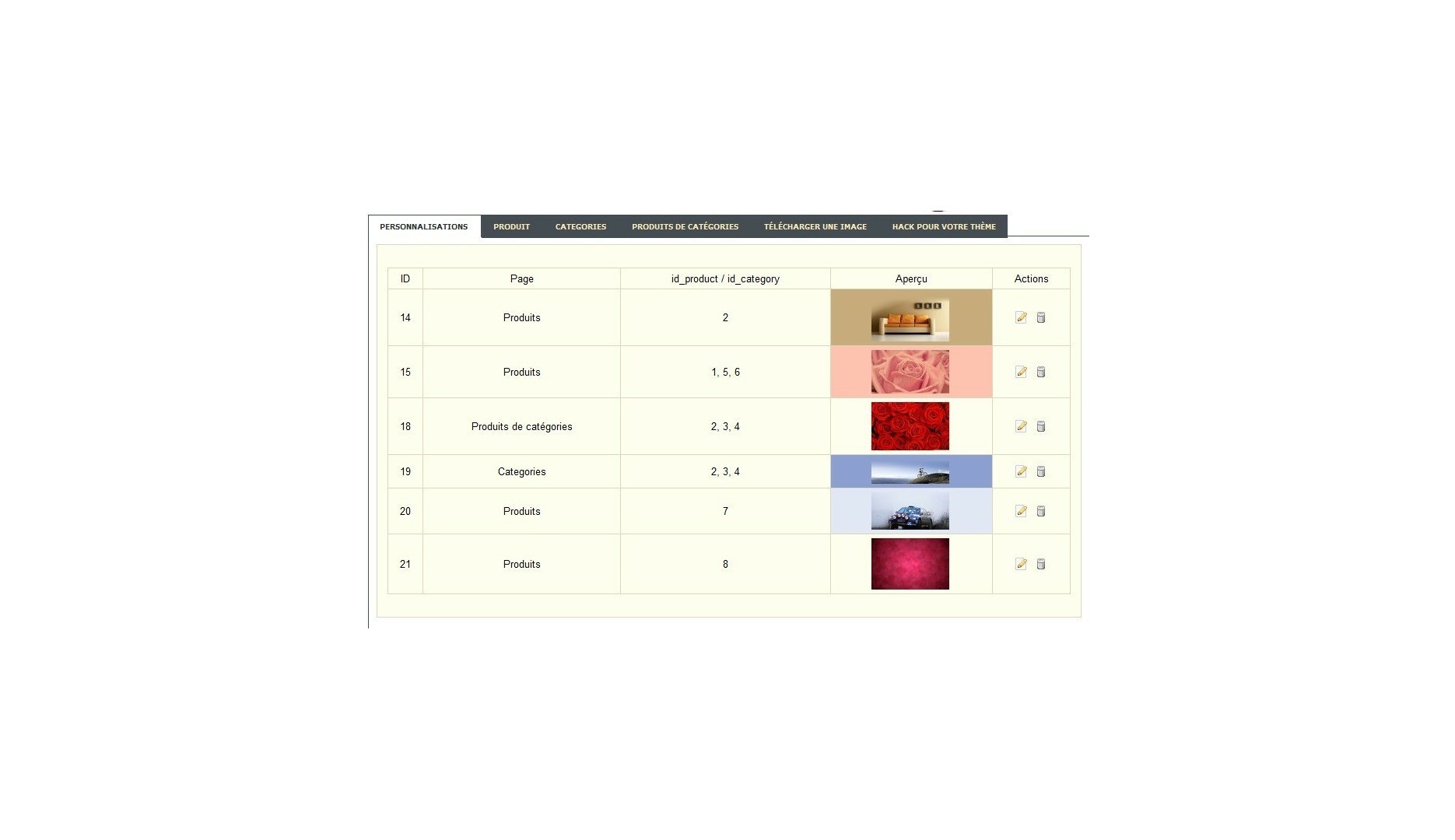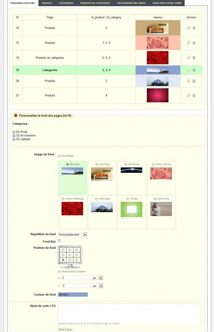 ¿Quieres personalizar sus páginas de productos y categorías específicamente, a un fondo de "equilibrio" o "Felices Fiestas", "San Valentín" ... Esto puede muy fácilmente y muy rápidamente.