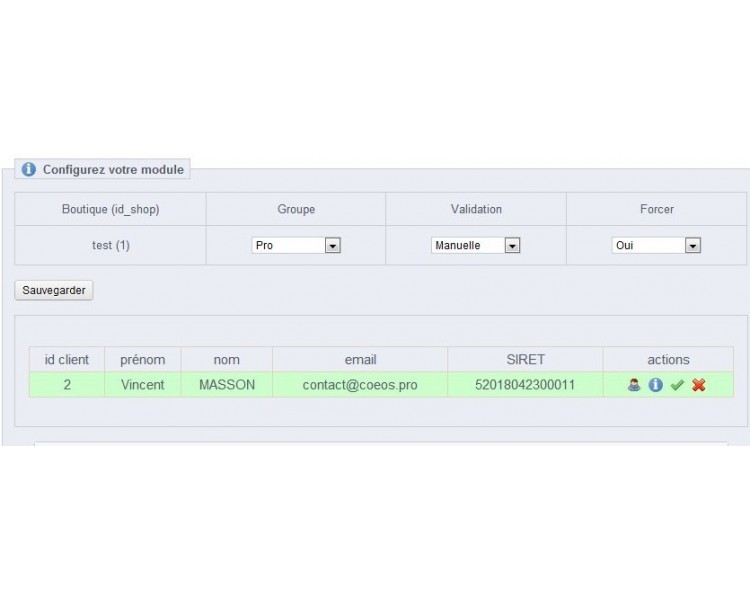 Este módulo permite a los clientes registrar su registro SIRET o en su cuenta y ser transferidos después de auto-commit (o manual) en un grupo de cliente de su elección.